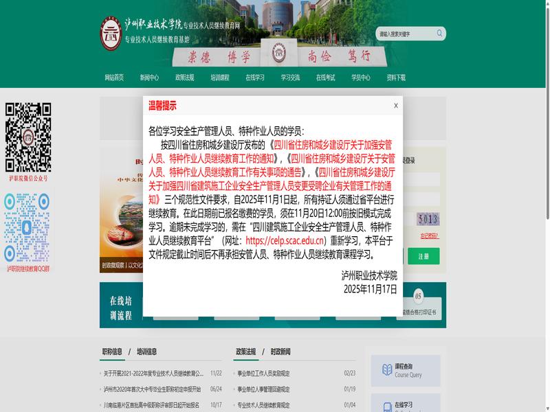 泸州职业技术学院专业技术人员继续教育网(https://jxjy.lzy.edu.cn/web/index)作为一个在线教育平台,为学员提供了便捷的学习途径。